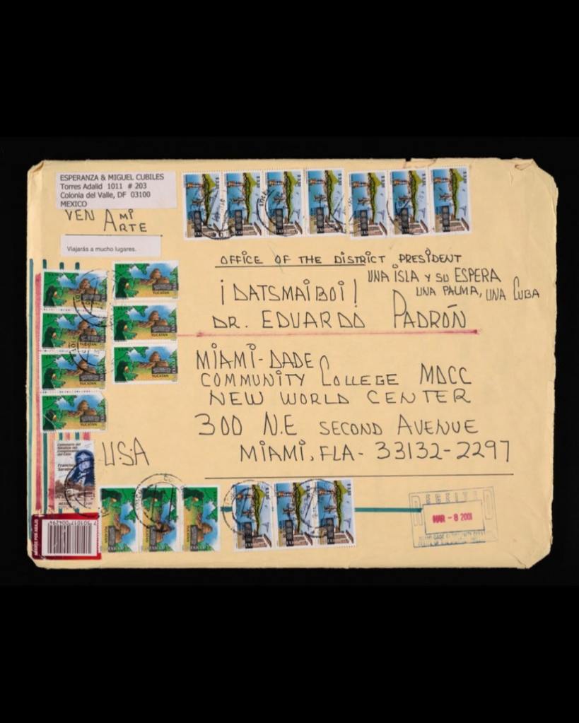 This illustrated envelope by visual artist Miguel Cubiles was used to mail his application to the Cintas Foundation for a fellowship in the Visual Arts category. Cubiles is an artist who left Cuba in 1961, studied at then-Miami Dade Community College (MDCC), and in 1980 settled permanently in Mexico. He is known for sending correspondence to friends and colleagues with humorous illustrations that include collage, evidenced in the way he addressed Dr. Eduardo PadrΓ³n, then President of MDCC. See this item, along with others from the CINTAS Foundation, Inc. records, at our exhibition, ππ©π¦ ππππππ ππ°πΆπ―π₯π’π΅πͺπ°π―: ππ― ππ³π€π©πͺπ·π’π ππ¦π³π΄π±π¦π€π΅πͺπ·π¦.