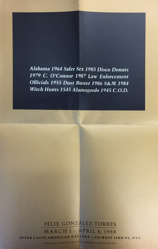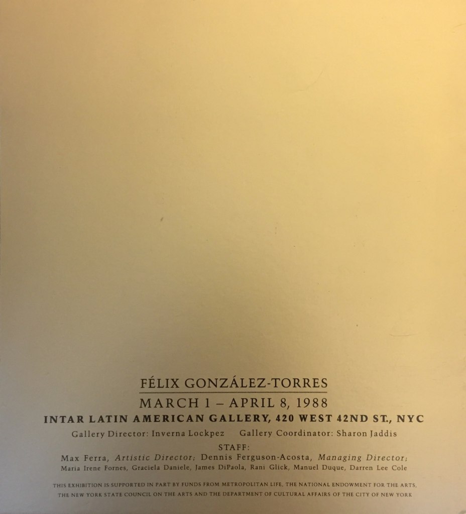 One of the most exciting aspects of “The CINTAS Foundation: An Archival Perspective” has been the opportunity to highlight new discoveries and different materials from the Cuban Heritage Collection and display them to the public for the first time. The exhibition catalog and accompanying poster of the late Cuban American artist, Félix González-Torres’ first solo exhibition in New York City, are among these treasured items.