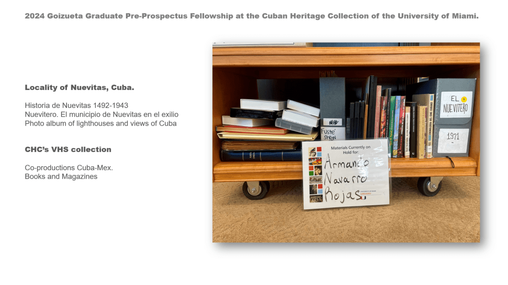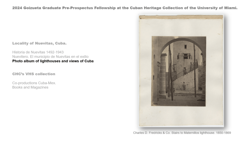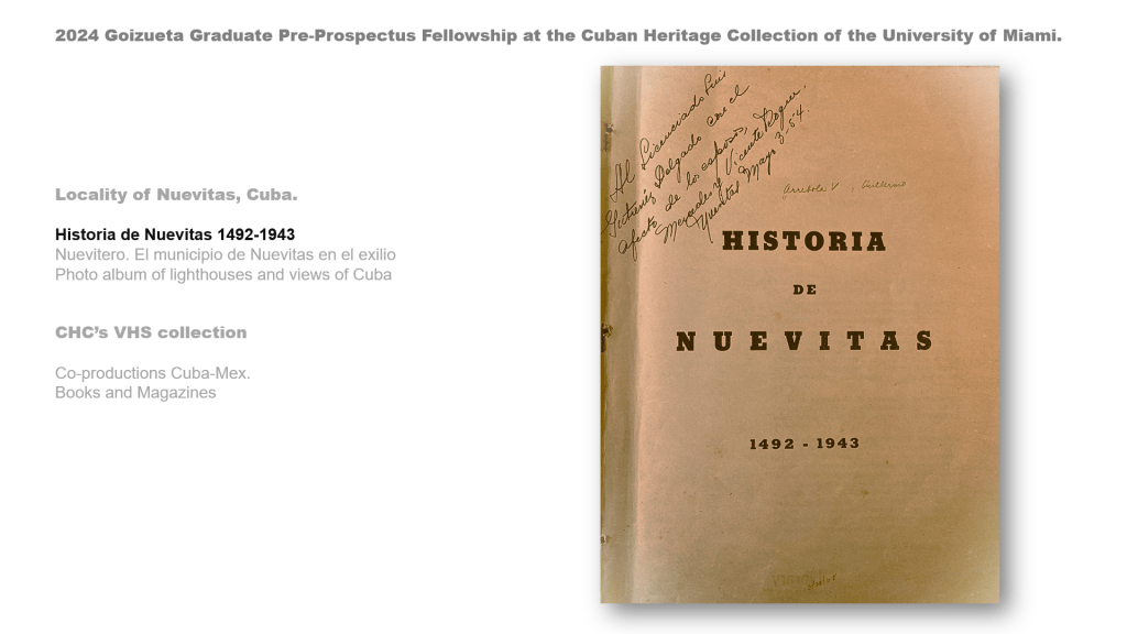 “My initial approach to the collection, without prior knowledge of the specific contents of the archive, focused on the locality of Nuevitas, Cuba. The interest in this territory lies in analyzing how the socialist-modern discourse, of hegemonic and totalitarian orientation, transforms the geographical, political, social, and cultural space of Nuevitas. In this regard, I was able to meet my objective by consulting the first editions of works by local writers Miguel Mejides and Enrique Cirules. I also accessed materials (newspapers, books, and photographs) that cover two periods and territories not prioritized by the official post-1959 Cuban narrative (Republic and exile), which I had not previously consulted in other archives: Historia de Nuevitas 1492-1943 by Guillermo Arrebola, a photographic archive of maritime, port, and religious infrastructures, and finally, the newspaper Nuevitero, published in Miami by the Municipality of Nuevitas in Exile.