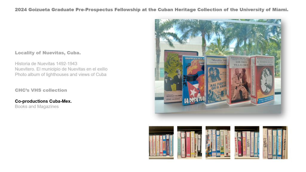 Additionally, I had access to the CHC’s VHS collection, which includes films from the 1940s and 1950s, a period of significant growth in Cuban cinematography before the establishment of ICAIC (Instituto Cubano del Arte e Industria Cinematográficos). This cinematography consists mostly of co-productions with Mexico, a country that, at the time, was experiencing the peak of its Golden Age of Cinema. However, despite their importance in terms of volume and reception, these co-productions have not received critical attention that goes beyond the value judgments associated with commercialization and the taboo of banality often attached to studio and commercially oriented cinema. From a traditional historiographical perspective, they are not considered fruitful examples of Mexican cinema from the era, nor have they been thoroughly studied from the Cuban side, as Cuban cinema prior to ICAIC has received little attention. These films are accompanied by magazines and newspapers (general magazines) that, from the perspective of the star system and film production, document the emerging Cuban film industry in the first half of the 20th century. This section also includes select and rare publications (books) from post-1959 that address not only this body of work but Cuban cinema in general produced during that period.