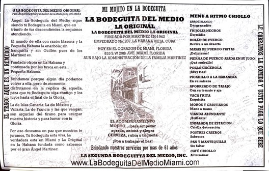 After the revolution, as Cubans made their way across the Florida Straight to Miami, many of these popular Havana restaurants moved with them, including La Bodeguita del Medio, Floridita, La Zaragozana, Rancho Luna, and others, setting up shop on S.W. Eighth Street, or Calle Ocho, in what we know now as Little Havana. While restaurant ownership and staff may have made their way to Miami, the physical buildings in Havana themselves often remained restaurants owned and run by the Cuban government, which led to stand-offs between the restaurants in exile and those located in their original buildings in Cuba. Menus from Floridita and La Bodeguita Miami advertise these moves and reopenings to their customers, claiming authenticity for themselves as the Cuban government continues to operate the original restaurants in Havana.