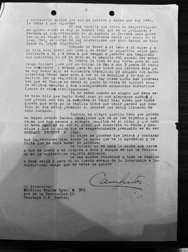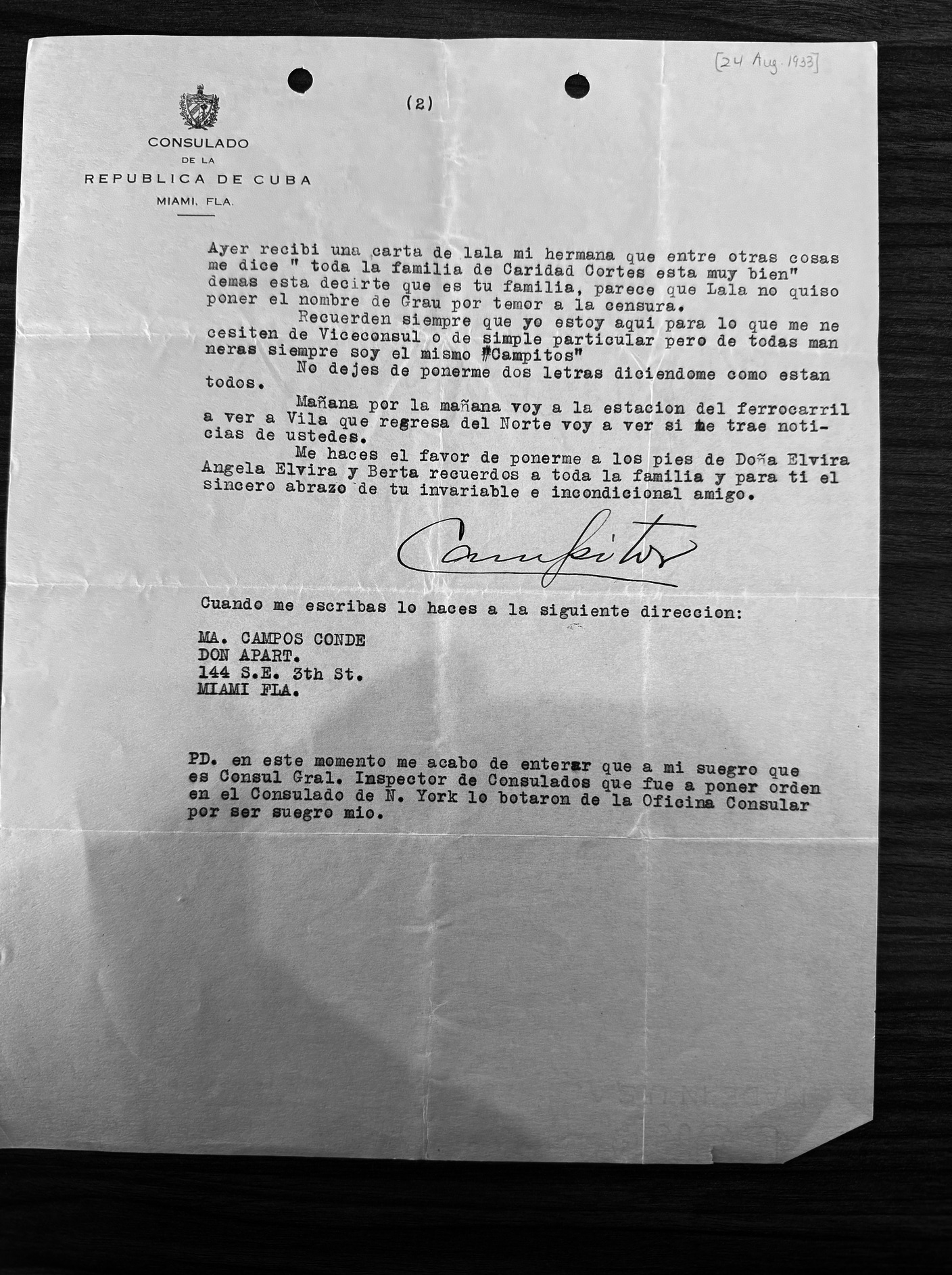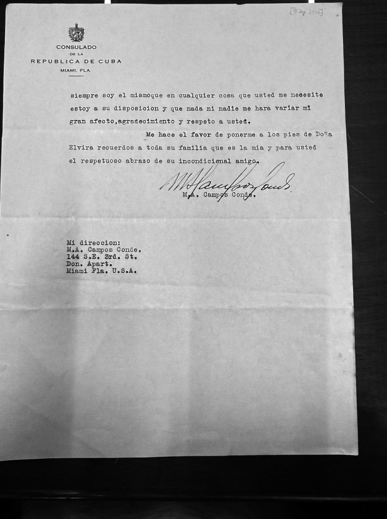 On August 24, 1933, viceconsul Campos wrote a letter on official consulate stationary to Ignacio Baldomero Grau, Gerardo Machado’s son-in-law, business partner, and all-around close confidant. Written less than two weeks after Machado had been ousted as President of Cuba, Campos tells Machado’s yerno to, “always remember that I am here for whatever you might need from me privately or as Viceconsul, but in any case I will always be the same ‘Campitos…'”[7]