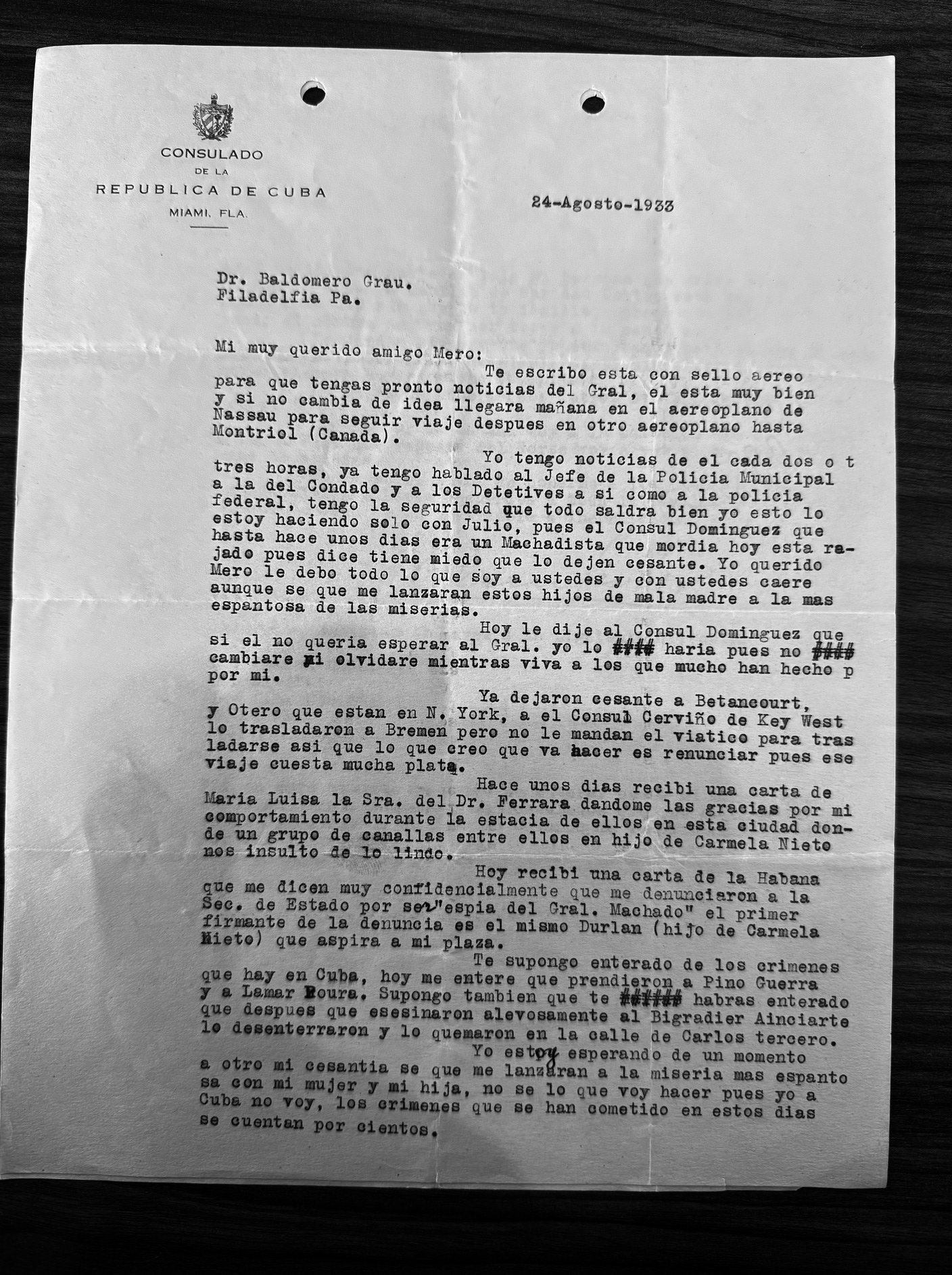 [7] Miguel Angel Campos Conde to Ignacio Baldomero Grau, August 24th, 1933. Gerardo Machado y Morales Papers, Cuban Heritage Collection, University of Miami Libraries, Coral Gables, Florida. CHC0336, Box 4, Folder 1.