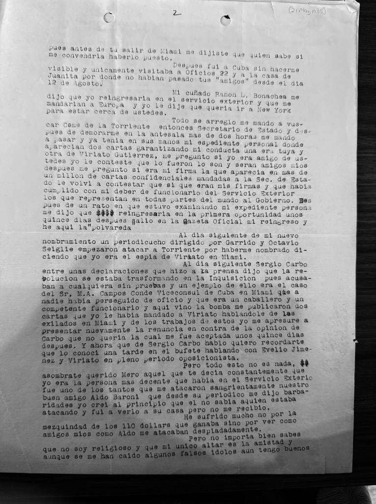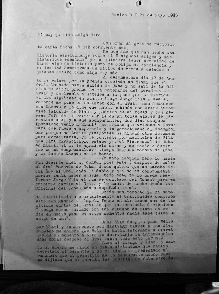 [19] Miguel Angel Campos Conde to “Mero,” May 21st, 1935. Gerardo Machado y Morales Papers, Cuban Heritage Collection, University of Miami Libraries, Coral Gables, Florida. CHC0336, Box 4, Folder 7.